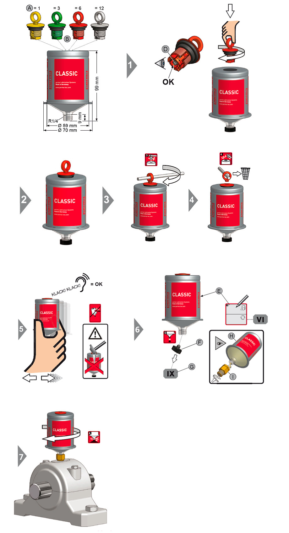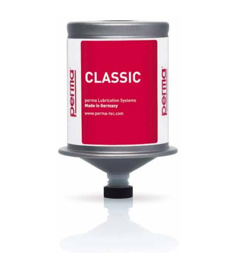 perma CLASSIC 可在 0 °C - +40 °C 的环境温度下使用,其基于电化学反应的工作原理 安全可靠。其润滑周期取决于按颜色编码的激活螺帽。根据应用的具体需求,您可以 分别选择在 1、3、6 或 12 个月内排完 120 cm³ 润滑油。由激活螺帽产生的压力(最 大 4 bar)可推动活塞向前移动,这样就可以持续不断地将润滑油一点一点地注入润滑 点。perma CLASSIC 还能完全防尘和防水,并能承受撞击和意外碰撞。