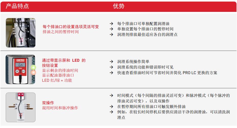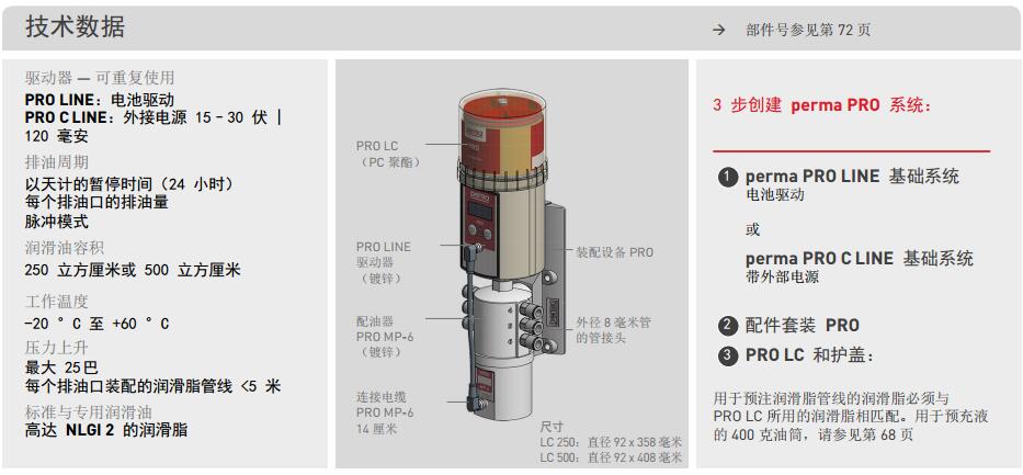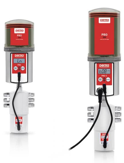perma PRO LINE 和 perma PRO C LINE 是用于线性导轨的可变多点润滑系统。排 油可精确适应制造商的规格。六个排油口都可以灵活设置润滑油的数量和再润滑间 隔。PRO LC 注满 250 或 500 立方厘米的润滑脂。产生的高压使每个排油口的远程装 配使用润滑脂管线长达 5 米。这增加了工作场所的安全性,同时允许对运行中的系统 进行可靠润滑。