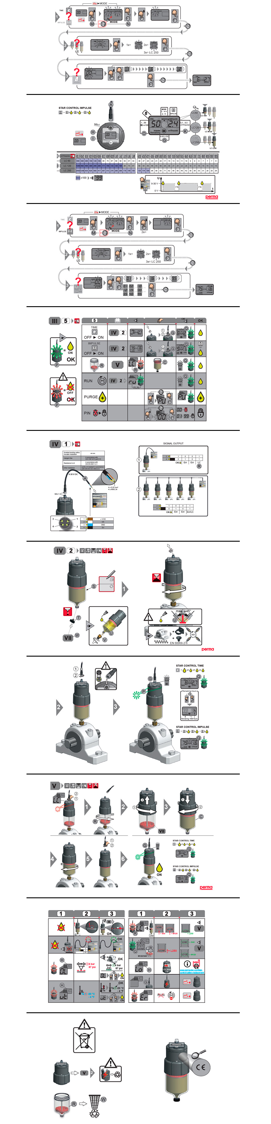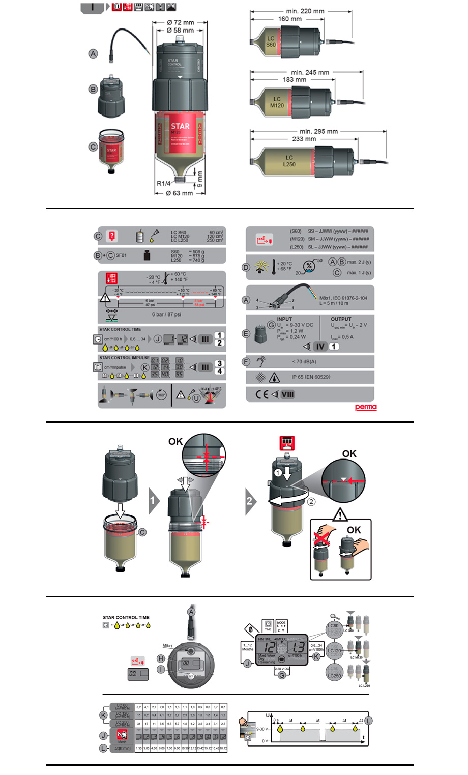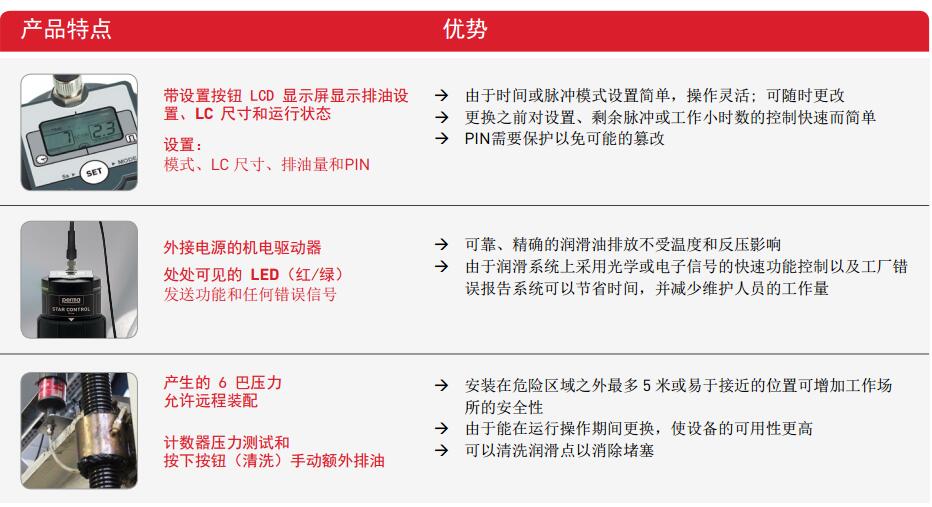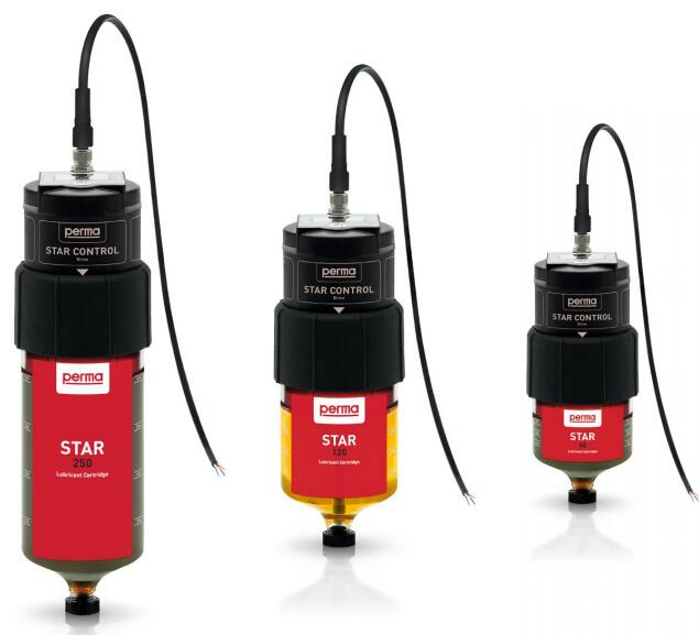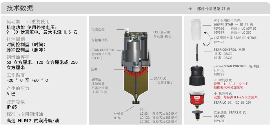 与 perma STAR VARIO(带电池组)相比,perma STAR CONTROL 通过电缆供应外部电源。 此外,运行状态可以通过此连接传送到 PLC。可灵活使用工作时间和脉冲两种集成式操作模 式。在时间模式下,润滑油分配依赖于运行小时数。在脉冲模式下,只要接通电压,就能分 配精确定义的油量。 perma STAR CONTROL 由机电驱动器和装有 60、120 或 250 立方厘米润滑油的 LC 组成。 在驱动器上设置所需的模式。润滑精确,不受温度影响,反压高达 6 巴。